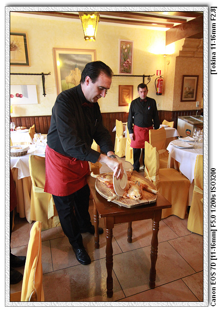 烤乳豬的作法是選用出生三週左右的小豬。先把小豬浸在牛奶及香料內(當然已經屠宰了~),大約浸泡5-7天(聽說天數是機密),利用牛奶的酵素將小豬肉的肉質纖維分解,之後才燒烤。這樣的烤乳豬相當嫩、酥、脆。此外,為了證明烤乳豬的有夠脆、有夠酥,不用刀子切割,直接用桌上的盤子當刀子。傳言當年的廚師為了向國王證明烤乳豬的酥脆,隨手拿了桌上的盤子就切、切、切,之後這就變成傳統,也成為塞哥維亞烤乳豬的豋場方式(據說有點店家為了證明盤子並無作假,不是拿鋼板的盤子,切完豬之後會將盤子砸地摔破,不過今天並無這樣做,每餐摔盤子可能會不夠買~)。