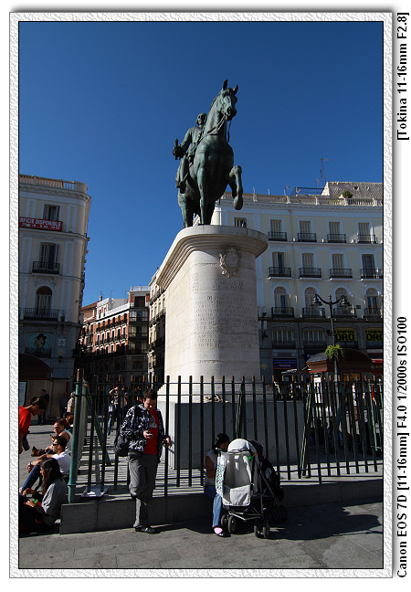 太陽門廣場是馬德里重要的中心點,因商店或是景點帶來的人潮,可說是終日人聲雜沓。以廣場為中心,一條條的街道以扇形向四周延伸,像太陽一樣,所以叫太陽門。四周一共有12條商店街。在這哩,其實是可以逛上一整天,如果對於精品有興趣的話。