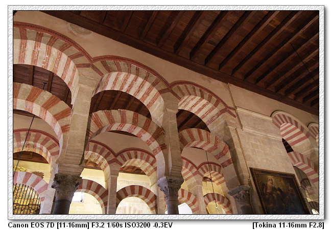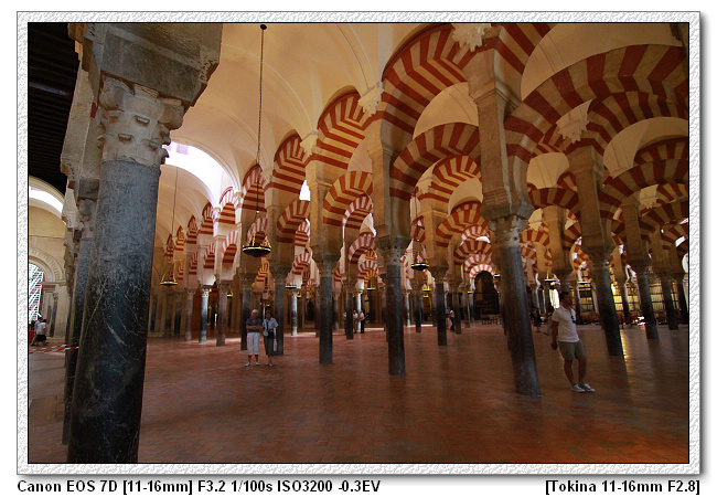 仔細看,可發現清真寺內的柱子每根都是不同樣式,也不同高度。因為當時摩爾王是很節儉的王,而底下的工匠也擁有這樣的特性,工匠一樣獻計,因剛到新的地方,為了節省經費,清真寺不需蓋的豪華,附近有很多羅馬人的廢墟,裡面有很多大理石柱子。於是將原本羅馬時期宮殿、神殿的廢棄柱子二次使用,這裡總共有1000根柱子。