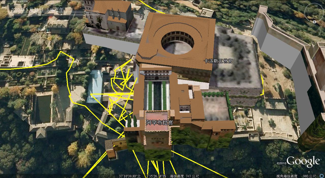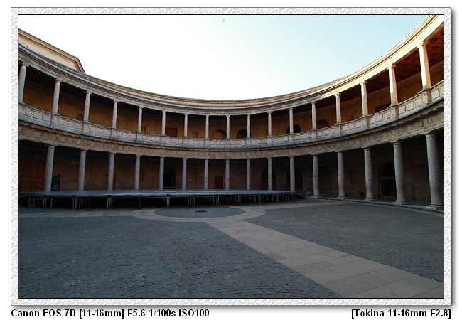 卡洛斯五世宮的建築師是米開朗基羅的學生,建築整體外方內圓,中間是寬廣的圓形庭院,周圍是兩層的柱廊。不過其實當初步未完全蓋好,只建好外觀,裡面的擺設並未完成,空空如也。現在這裡設有阿爾罕布拉美術館和格拉納達省立美術館。