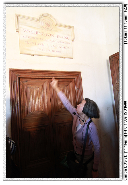 當時格拉那達把整個阿罕布拉宮叫作總督府,歐文先生得到當地政府的同意,於是便住進現在這個房間,一住就住了三個星期。晚上抓鬼,白天則找當地老先生,將當地傳說集結成冊,並寫了『Tales of Alhambra』這本書,才開始被世界所重視。這位先生最大的成就,不是在政治方面,而是在幫西班牙打廣告。