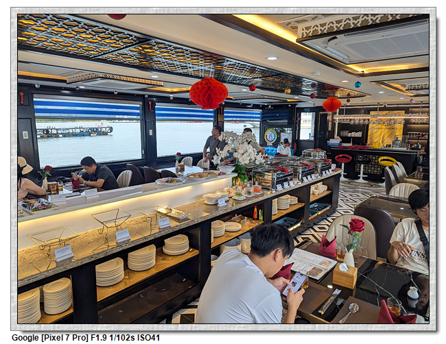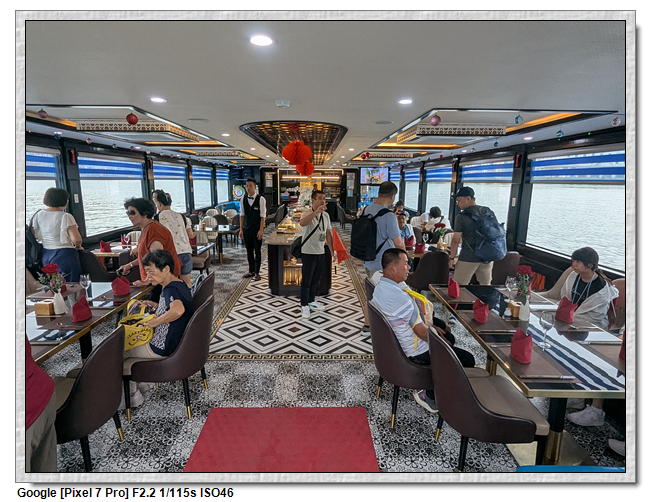 遊艇由3層寬敞典雅的樓層組成,配備各種高級設施。一樓是豪華的餐廳空間,巨大的自助餐檯,舒適的座椅。二樓也是餐廳和酒吧空間。三樓是虛擬checkin的露台區,每個角落都美輪美奐。