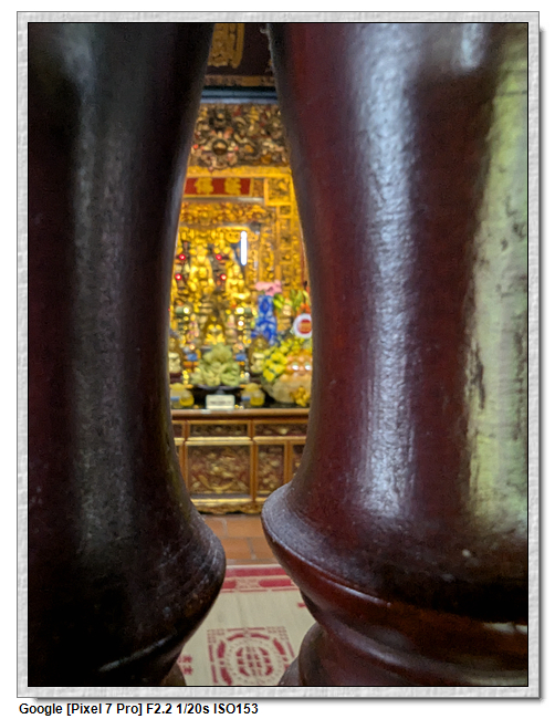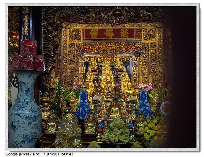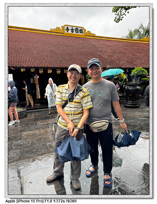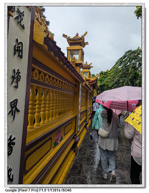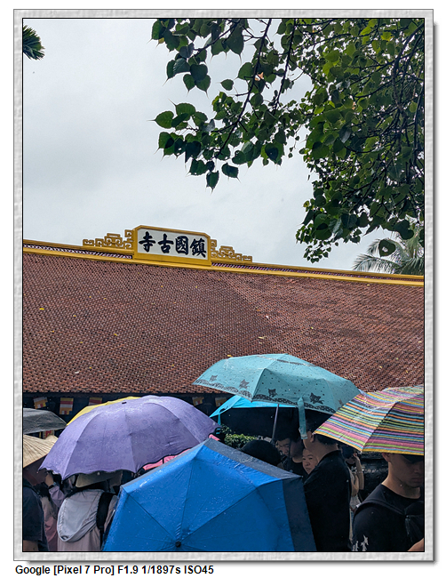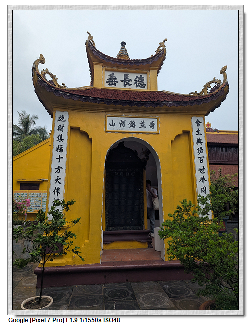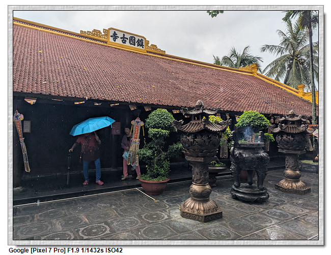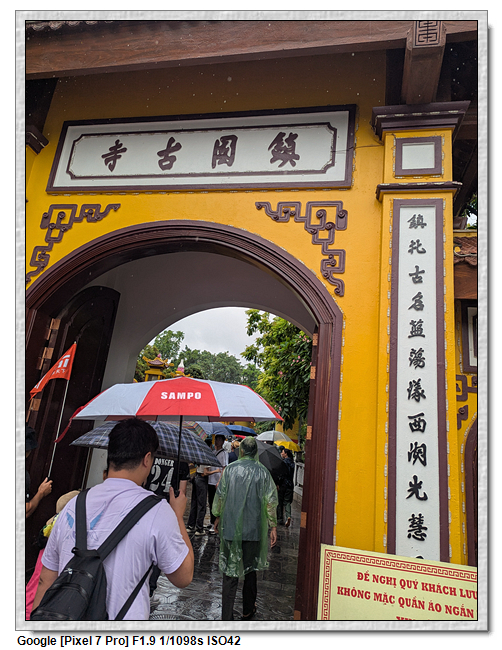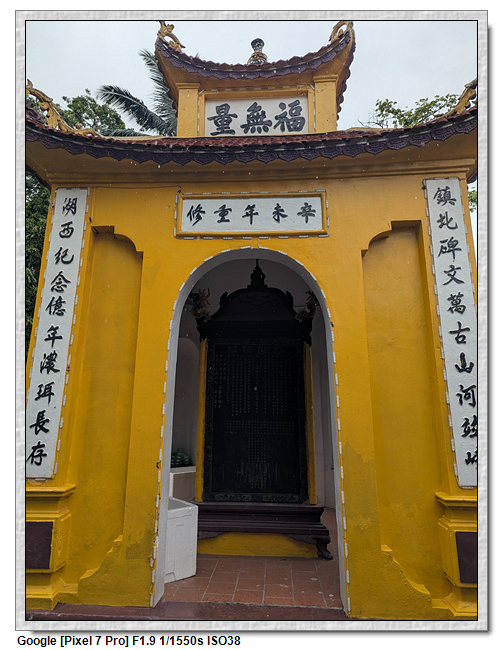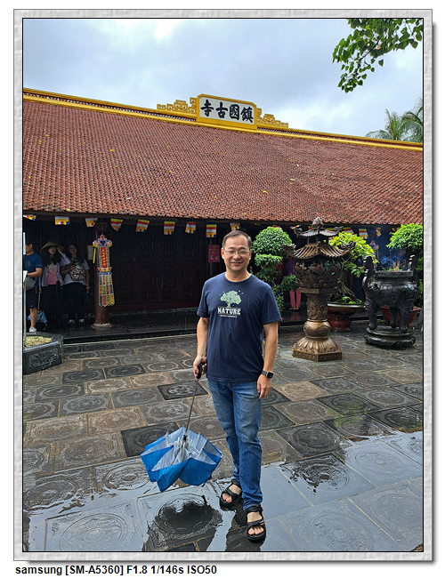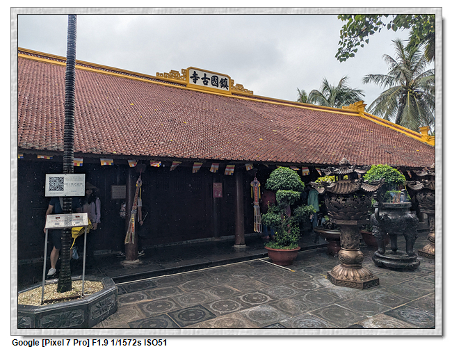 一開始,導遊問我們廟的上面是寫什麼,當然我們看得懂是"鎮國古寺",越南的古廟上的文字,大多都是以中文字為主,一般越南人是看不懂的。中文字一般以廟的年齡200年為界線,超過200年以上的都是繁體字,200年以下的都是簡體字(但簡體字的出現也不過是60年的事)。
