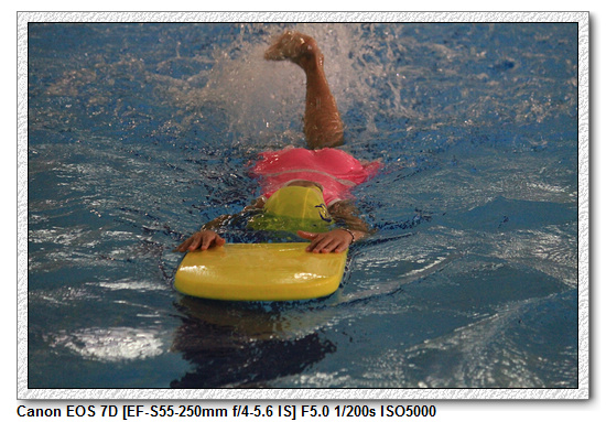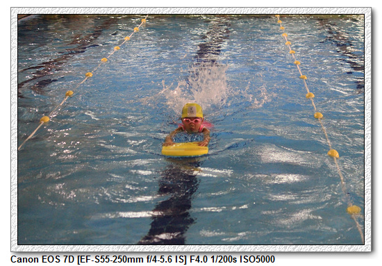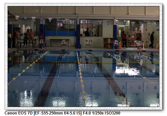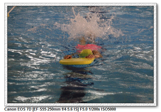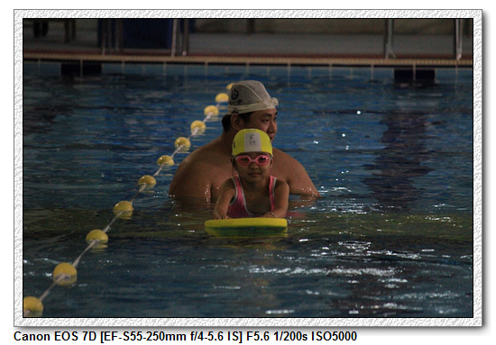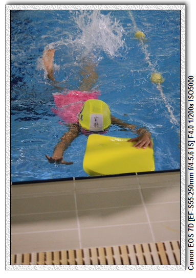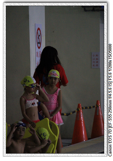 第一個比賽項目,就是15公尺踢水,不過紅帽組的先進行,之後就是黃帽組。參加的人數很多,小羽安排在第八組。竹北分校的泳池看起來很新,整體空間比融合分校大多了。